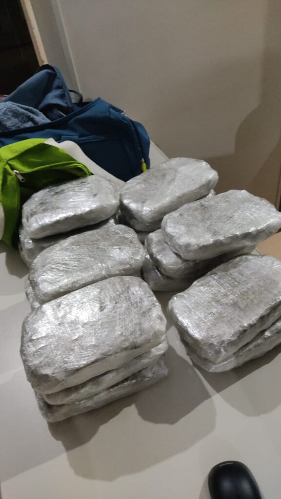 Após vistoria nas bagagens da mulher, de nacionalidade boliviana, a equipe encontrou vários tabletes de maconha dentro de uma mochila.