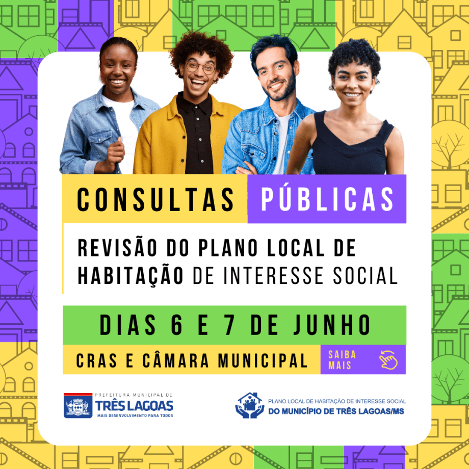 A Prefeitura Municipal de Três Lagoas, por meio da Secretaria Municipal de Governo e Políticas Públicas (SEGOV), convida a todos os interessados a participarem das Consultas Públicas da Revisão do Plano Local de Habitação de Interesse Social (PLHIS) nos dias 6 e 7 de junho, quinta e sexta-feira, com o objetivo de promover a discussão e aprimoramento das políticas habitacionais no município.