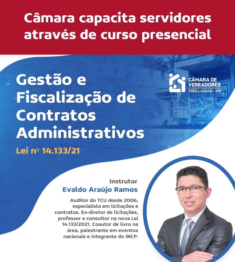 A Câmara Municipal de Três Lagoas realizará, nos dias 07 e 08 de agosto, uma capacitação sobre a Gestão e Fiscalização de Contratos Administrativos, em conformidade com a nova lei de licitações (Lei 14.133/21). O treinamento é voltado para servidores fiscais de contrato (administrativos, técnicos e substitutos), gestores de contrato, setores de Compra e Licitação, Controladoria, Jurídico e todos os diretores da Casa, com expectativa de 50 participantes.