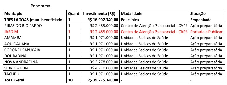 Além disso, encontra-se em tramitação a publicação de Portaria que autoriza a construção de 1 Centro de Atenção Psicossocial – CAPS, no município de Jardim.