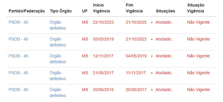 Com a saída do ex-governador Reinaldo Azambuja do ninho tucano e o fim da vigência do diretório biênio 2023-2025, o PSDB-MS está sem liderança oficial. Conforme o site do Tribunal Regional Eleitoral de Mato Grosso do Sul (TRE-MS), a agremiação não tem nenhum diretório ativo.