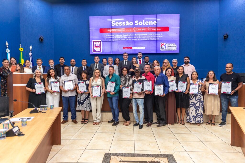 Em uma noite marcada por emoção e reconhecimento, a Câmara Municipal de Três Lagoas realizou na última quarta-feira (28) sessão solene em homenagem ao Dia do Servidor, com a entrega do diploma Excelência no Serviço Público a 15 servidores municipais. O evento, que lotou o plenário, foi presidido pelo vereador Tonhão e contou com a presença do prefeito Dr. Cassiano Maia, que fez um anúncio histórico para a categoria.