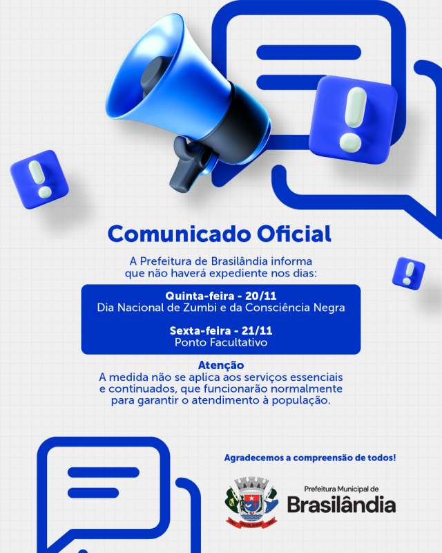 A Prefeitura Municipal de Brasilândia comunica alteração no funcionamento dos serviços públicos municipais nesta quinta e sexta-feira, dias 20 e 21 de novembro. Na quinta-feira, 20 de novembro, não haverá expediente nas repartições públicas em razão do feriado do Dia Nacional de Zumbi e da Consciência Negra, data integrante do calendário oficial brasileiro.
