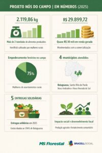 A força da união e do protagonismo feminino no campo tem gerado resultados concretos no leste de Mato Grosso do Sul. Em 2025, o Projeto Nós do Campo, iniciativa da MS Florestal em parceria com o Programa Bracell Social, garantiu a doação de mais de 2 toneladas de alimentos a famílias em situação de vulnerabilidade, além de impulsionar a geração de renda para mulheres produtoras rurais da região.