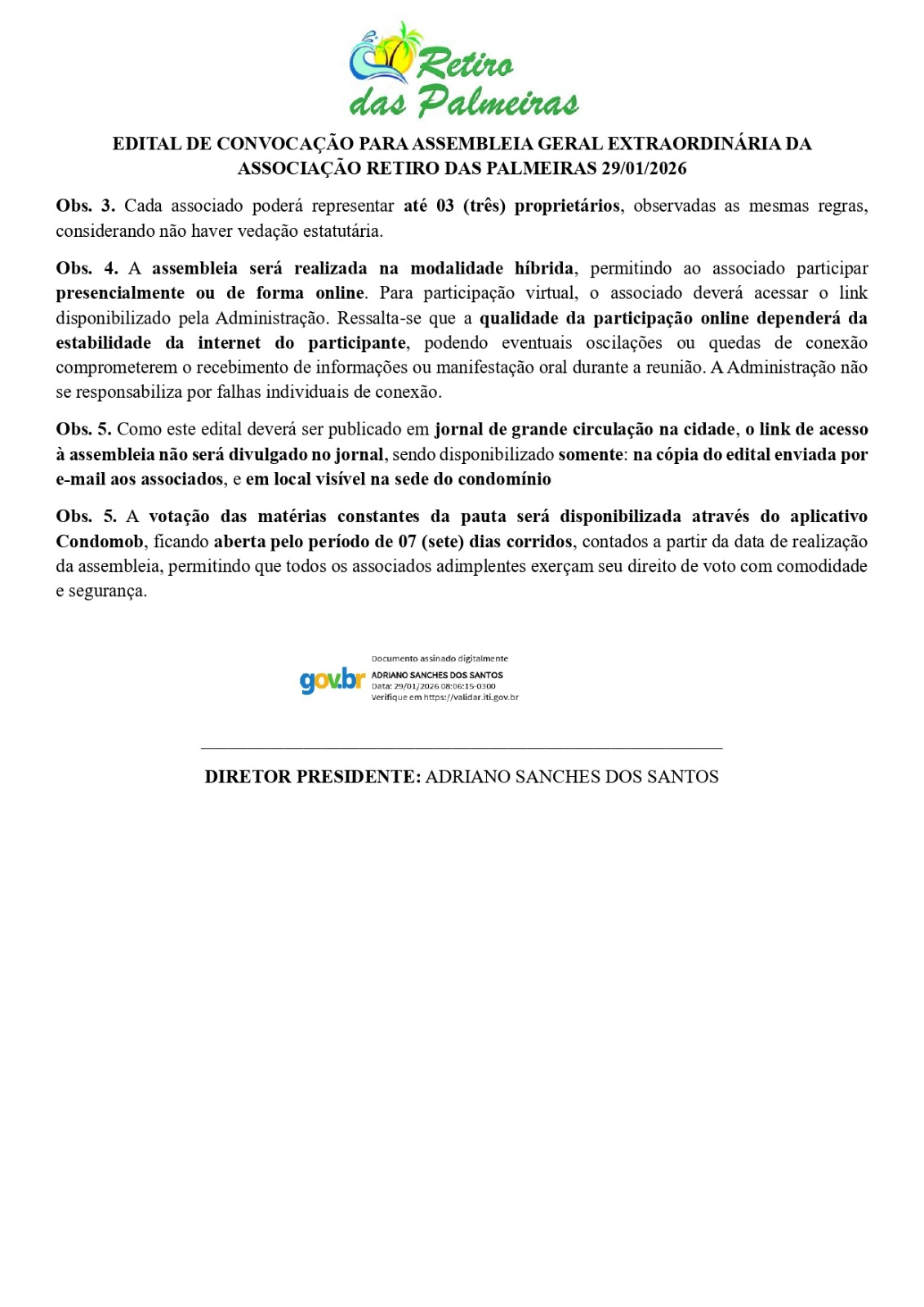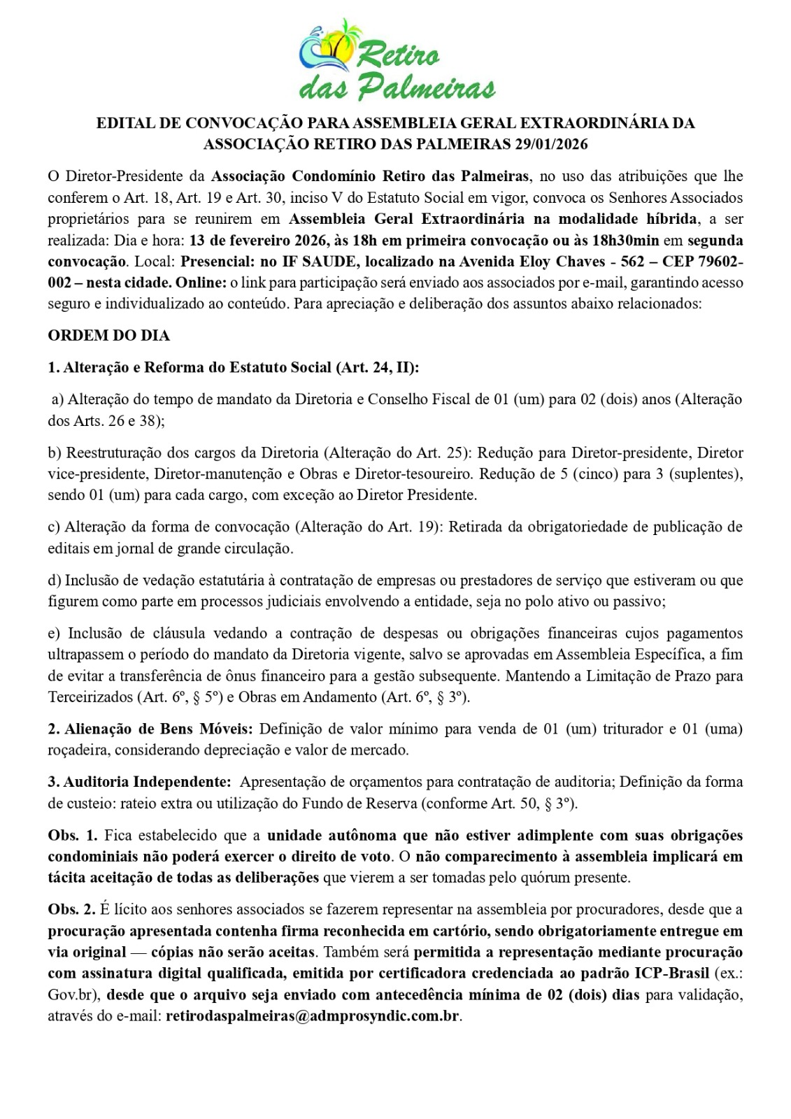 EDITAL DE CONVOCAÇÃO PARA ASSEMBLEIA GERAL EXTRAORDINÁRIA DA ASSOCIAÇÃO RETIRO DAS PALMEIRAS 29/01/2026 29 de janeiro de 2026