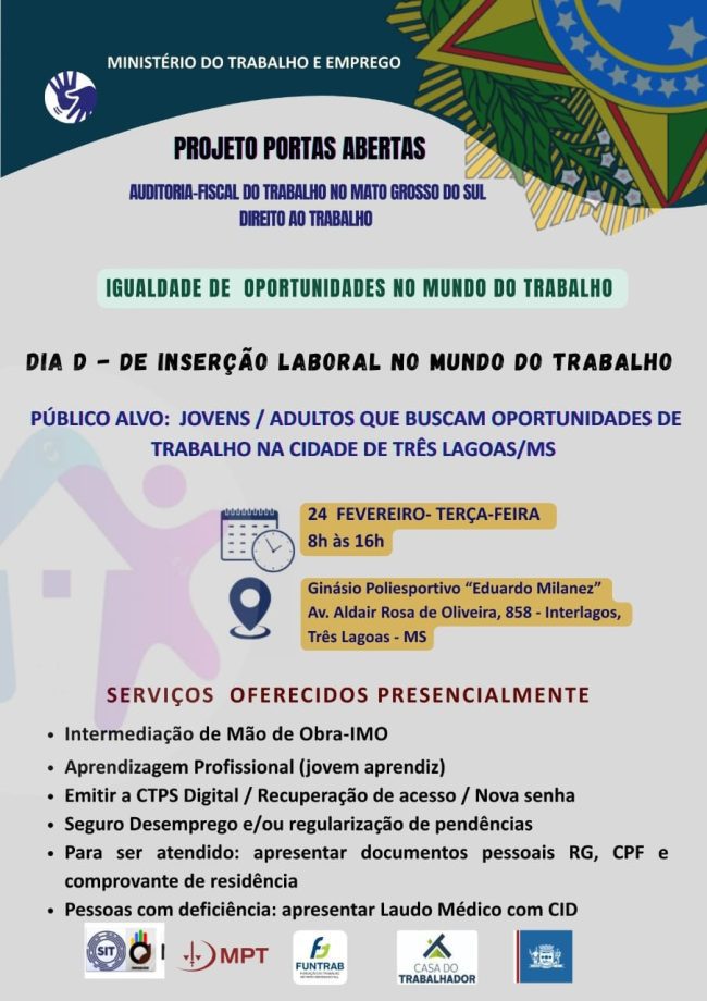 O Ministério do Trabalho e Emprego-MTE, em parceria com a Casa do Trabalhador (FUNTRAB), Prefeitura Municipal de Três Lagoas e Ministério Público do Trabalho, realizará no dia 24 de fevereiro, o Feirão de Vagas “Dia ‘D’ de Inserção Laboral no Mundo do Trabalho”. O feirão será realizado no Ginásio Poliesportivo Eduardo Milanez, das 8h às 16h.